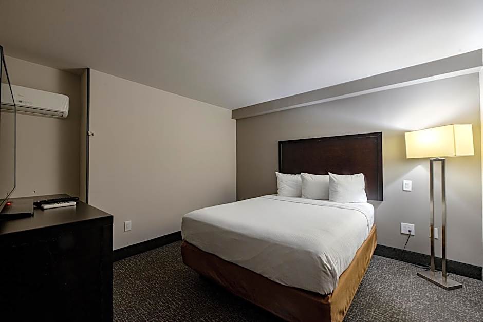 This one-bedroom suite features a separate living room with a sofa and plush lounge seating. A wet bar, microwave and small refrigerator are also provided.